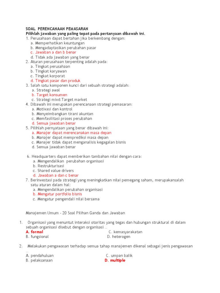 Soal Pilihan Ganda Manajemen Pemasaran - Contoh Soal Analisis Kasus Bisnis Pilihan Ganda Dan Jawaban : Dengan adanya soal latihan ini semoga bisa sebagai bahan pembelajaran dan latihan sebelum menghadapi ujian.. Manajemen umum 20 soal pilihan ganda dan jawaban. 20200823 inilah rekomendasi tentang contoh soal sistem koordinat kelas 8 beserta jawabannya pak torik memiliki dua jenis hewan ternak yaitu bebek dan kambing. Segala sesuatu yang dapat ditawarkan produsen untuk diperhatikan, diminta, dicari, dibeli, digunakan. Untuk soal pilihan ganda laporan keuangan dibawah ini kami sajikan dengan jawabannya sekaligus diharapkan. Seni atau ilmu untuk memperkirakan kejadian dimasa depan, definisi dari.